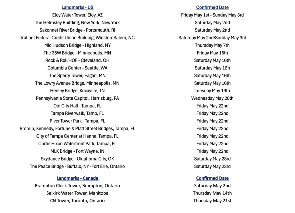 Throughout the month, landmarks across the country will be lit up to help raise awareness for Fibromuscular Dysplasia (FMD). If one of the landmarks is close to you, consider getting together with fellow patients, friends, and family to see it in person and show support for the FMD community.